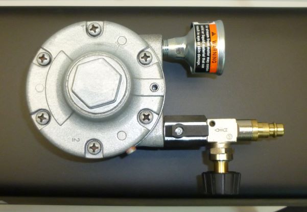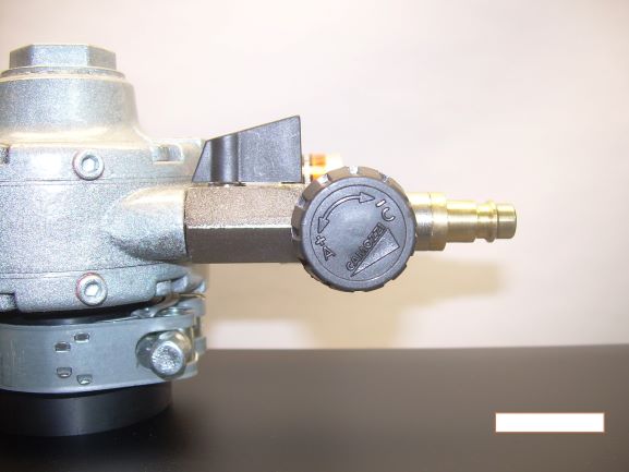 Zbliżenie na zawór odcinający, regulator obrotów i króciec przyłączeniowy.